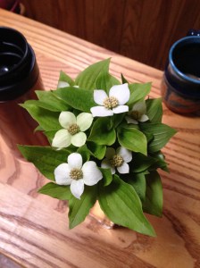 I still find myself thinking wistfully about the bluebirds, wondering if the little ones have fledged. I think the hardest thing about our nomadic life—Chris would say the best thing—is making the transition from one place to another. But I’m settling in here, it’s starting to feel like home. Yesterday we went for a long hike along the shore, and I found some white flowers, a carpet of them beside the trail, actually, so many that I didn’t feel bad picking a little bouquet for myself. If any of you recognize these as an endangered species, please don’t tell me.