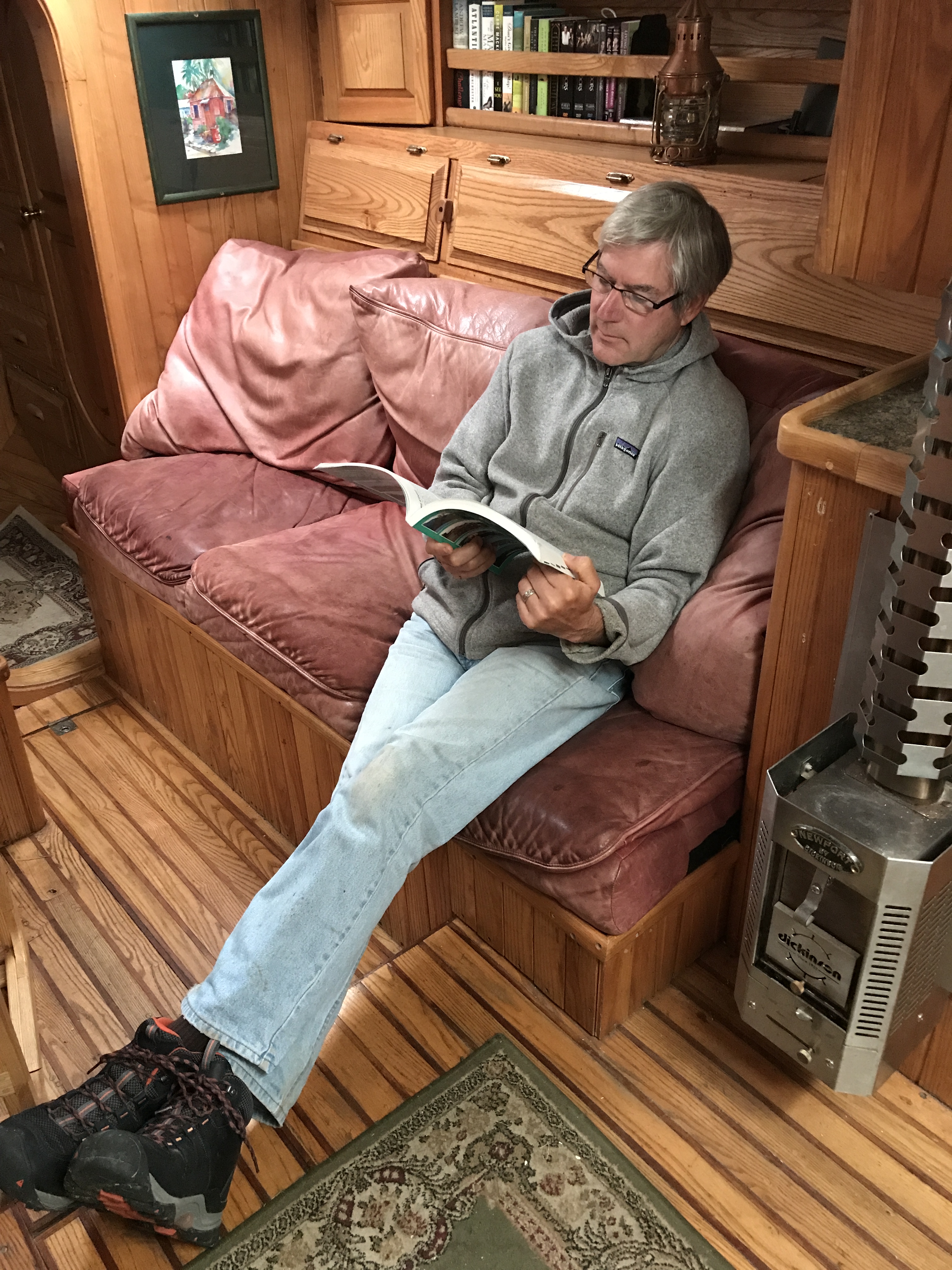 Chris is happy to be back on the boat. He hasn’t stopped grinning since we arrived. I’m having a bit of a struggle. I feel unsure about living in a boatyard in the middle of nowhere, and the boat feels, well, weird.