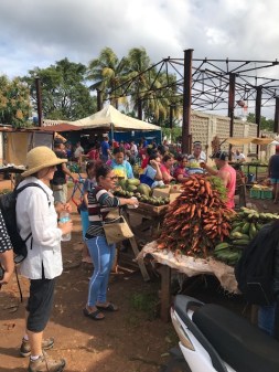 Saturday is market day Jaimanitas, a little village about eight miles west of Havana and right beside Marina Hemmingway, where we’re spending Christmas. Chris and I shoulder our backpacks and set out before the day gets too hot—but we’re already too late. We’re drenched in sweat by the time we reach the market square, which is crowded with people and cars and horse-drawn farm wagons. There’s a long line-up at the main produce stall, but we decide to see what’s on offer at the smaller stalls before taking our place in the queue.