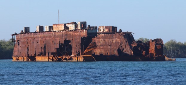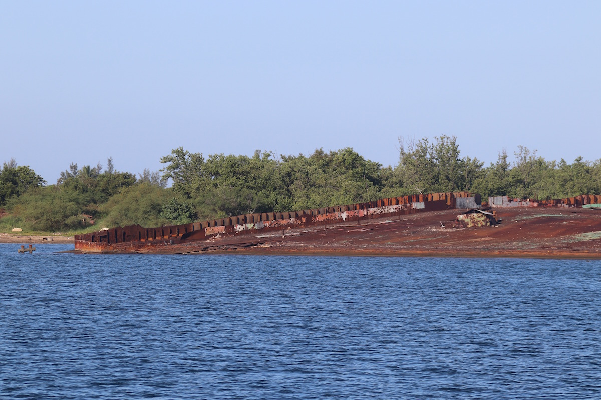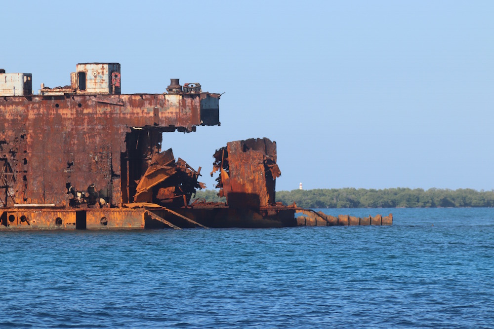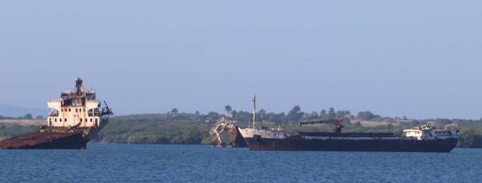 A speck just off the shore slowly resolves itself into a massive, rusting steel hulk as we thread our way through the narrow channel into Bahia Honda.