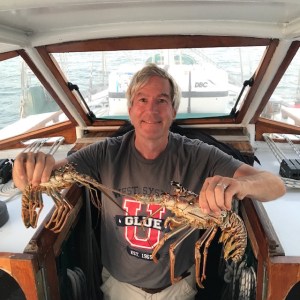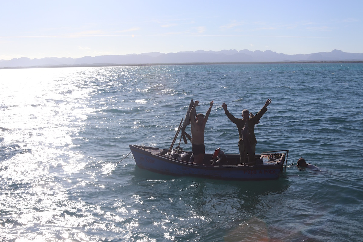 We enjoyed some nice sailing once we finally left Cayo Levisa, encountered our first lobster fishermen—actually, we thought the tiny open boat a good mile offshore was in some kind of trouble. There was a man in the water, and two men on the boat were waving their arms at us. We dutifully dropped our sails and motored over to them only to discover that all they wanted was to “give” us some lobster. The man in the water was a diver. He was tethered to the boat with a length of rope and pulled the boat behind him as he worked his way along the coral heads. I can’t imagine it was easy going—the two men in the boat were quite substantial and there was a heavy-looking one-cylinder diesel engine sitting in the bottom of the boat. But whatever they were doing, it worked: they had plenty of lobster.