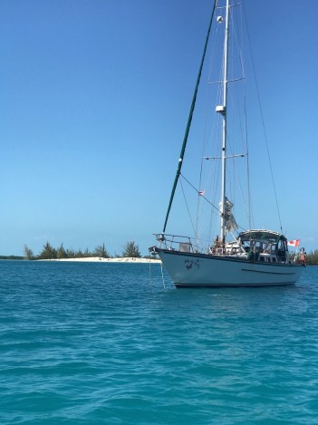 And it was. Our anchor was firmly buried in mud, but the boat danced around as the wind clocked. We could see waves breaking across the mouth of the entrance of the little channel we were in. It took five days for things to settle down enough for us to resume our journey—straight into the wind, of course. Remember the augmented diurnal trade winds?? We had to move east right into them to get a good angle to cross the Gulf Stream to the United States. Remember the Gulf Stream? That big river out in the ocean? We didn’t want to mess with it.