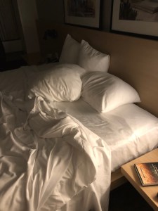We checked into a hotel—there were maybe three cars in the parking lot, and one nervous young woman at the front desk, keeping her distance. We let ourselves into our ground floor room (no elevators to negotiate) and began wiping down all the surfaces.